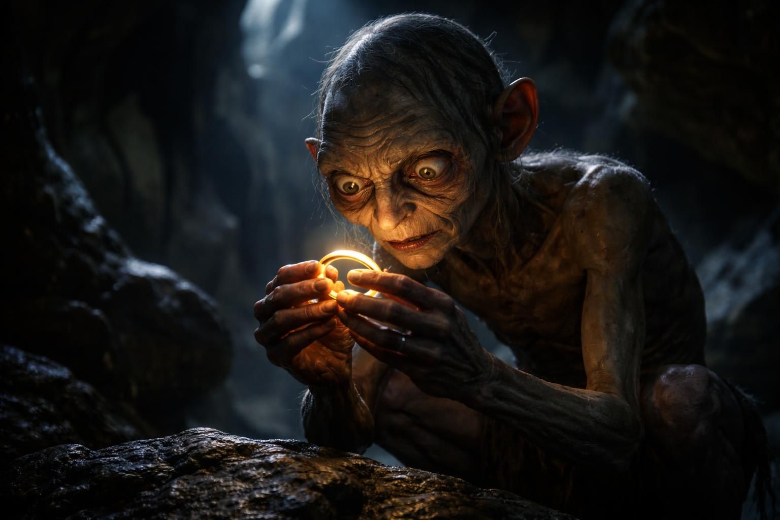 Gollum dégorge parfois une lueur d’humanité, des échos de son ancienne vie de Hobbit, ce qui renforce son caractère tragique. Cela rappelle à chacun d’entre nous que même dans l’obscurité, il peut exister des restes d’innocence. Cependant, cette lumière est constamment étouffée par l’ombre de l’Anneau. Son obsession pour cet objet devient le fil conducteur de son existence, ainsi que son fardeau.